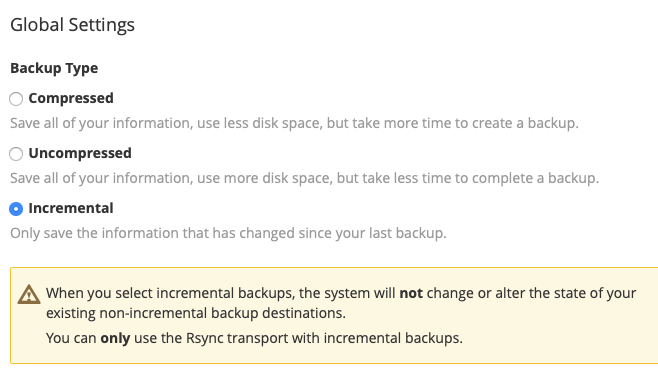 - پشتیبان گیری فشرده: فایل ها و پوشه های شما در فایلی به نام فایل tar gzip-compressed فشرده می شوند. کندتر است اما فضای کمتری را اشغال می کند.